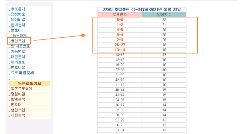 로또 당첨 번호 중에서 연속되는 숫자 2개를 가지고 통계를 내본 결과도 확인할 수 있는데요. 좌측 소메뉴에서 "출현조합"을 클릭하면 확인이 가능합니다. 가장 자주 출현한 연속된 숫자는 5번과 6번이네요. 1번과 2번의 경우에도 꽤 많이 1등에 당첨된 이력이 있습니다.
