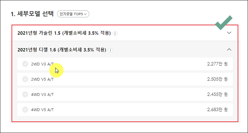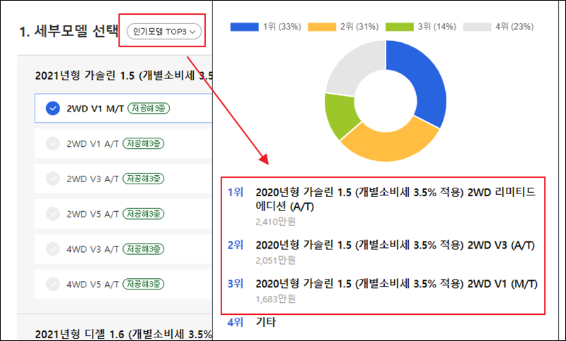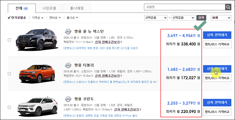 당장 쌍용자동차를 구입한 것은 아니라서 세부모델을 정하지 않을 수 있어요. 이런 경우에는 “인기모델 TOP3” 버튼을 클릭해 보세요. 그럼 신차가격표 확인용으로 사용하기 좋은 모델을 찾는 데에 도움이 될 거에요.