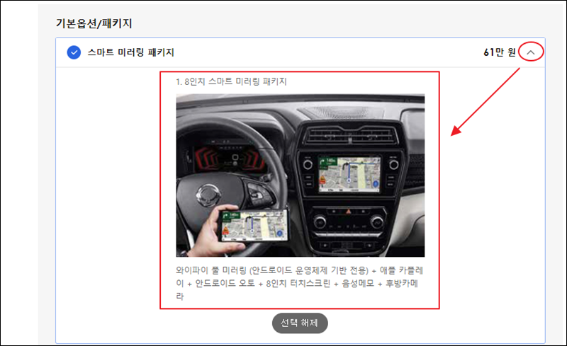 쌍용자동차에서 정한 옵션명만 가지고는 어떤 기능을 하는지 모를 수 있어요. 이런 경우에는 옵션 가격표 옆에 있는 화살표를 클릭해 보세요. 그럼 해당 옵션에 대한 설명이 나타나요.