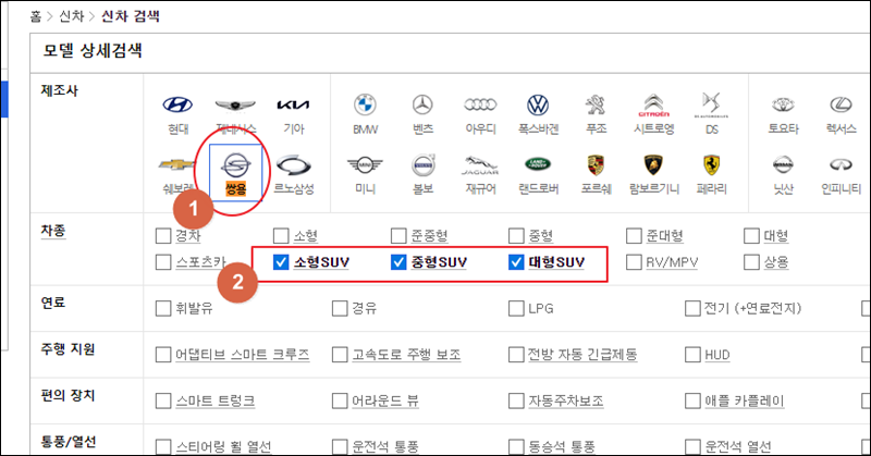 모델 상세검색 페이지가 열렸는데요. 여기에서 제조사는 쌍용자동차를 선택해 주세요. 나머지 조건은 본인이 원하는 것을 체크하면 돼요. 쌍용자동차의 SUV 차량이 유명하기 때문에 저는 소형, 중형, 대형 SUV 차량을 선택해 보았어요.