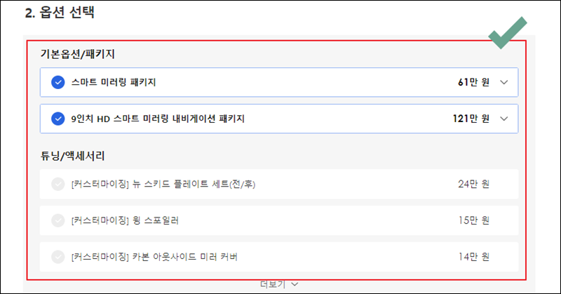 이번에는 차량에 들어갈 옵션이에요. 세부모델과 함께 많은 비용이 추가되는 부분인데요. 본인에게 필요한 옵션을 모두 체크해 주세요.