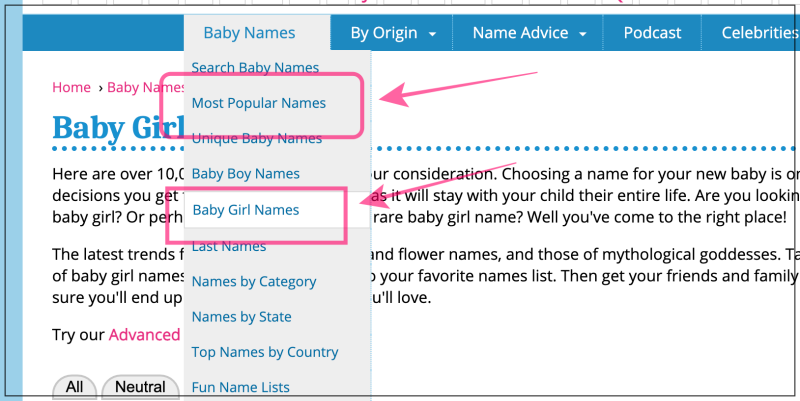 제가 이곳에서 예쁜 영어이름을 찾는 방식을 알려드릴게요. 저는 2가지를 주로 이용하는데요. 메뉴에서 Baby Names를 클릭해 보세요. 그럼 가장 인기 있는 이름을 알 수 있는 Most Popular Names 메뉴가 있어요. 보통 예쁜 영어이름이 인기가 높아요. 그 다음에는 여자 영어이름만 모아 놓은 Baby Girl Names가 있는데요. 두 가지를 함께 이용하면 마음에 드는 이름을 찾을 수 있을 거에요.