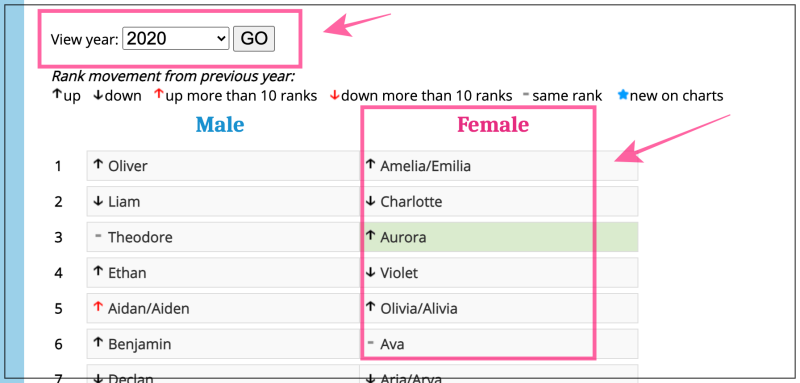 인기 있는 예쁜 영어이름을 살펴볼게요. 연도별로 인기 있는 이름을 살펴볼 수 있는데요. View year에서 연도를 선택한 후 GO 버튼을 클릭해 주세요. 그럼 남자와 여자 영어이름이 쭉 나와요. Female 부분이 여자를 의미하는데요. Amelia, Emilia, Charlotte, Aurora, V iolet, Olivia 등 예쁜 이름이 쭉 나오네요. 순위를 참고하시면 더욱 도움이 될 거에요.