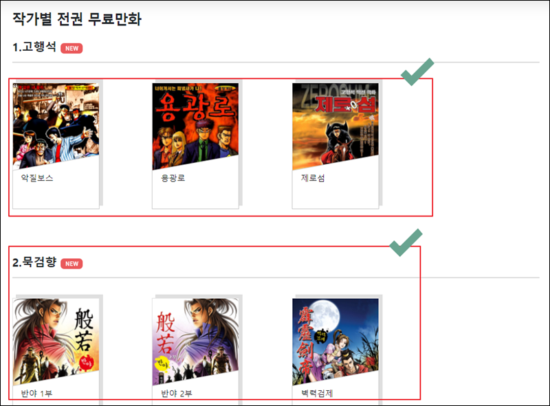 좋아하는 작가가 있다면 스포츠조선 사이트에서 "작가별 전권 무료만화" 카테고리를 참고해 보세요. 고행석, 묵검향, 천제황, 이종진, 황재, 조명운 등 국내 유명 만화 작가의 작품을 모아서 살펴볼 수 있습니다. 고행석 작가의 악질보스, 용광로, 제로섬과 묵검향 작가의 반야 1부와 2부, 벽력검제가 보이네요.