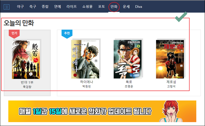 스포츠조선 사이트에 접속했습니다. 메뉴를 보면 야구, 축구, 종합, 연예, 라이프, 쇼핑몰 등이 보이실 텐데요. 여기에서 만화를 클릭해 주세요. 그럼 스포츠조선의 무료만화 페이지에 접속할 수 있습니다. 안내 표시를 통해 확인할 수 있듯이 매월 1일과 15일에 새로운 무료만화가 업데이트 되는데요. 지금 당장 보고 싶은 만화가 없더라도 나중에 보고 싶은 만화가 업데이트 될 수 있습니다.