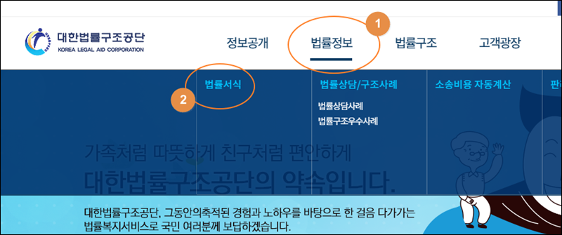 대한법률구조공단에서는 여러 가지 법률 서비스를 제공하고 있어요. 상담도 받아볼 수 있고, 법률구조도 이용할 수 있죠. 여기에 더하여 다양한 정보와 자료를 제공하기도 하는데요. 무료다운 받을 수 있는 법률서식이 꽤 많아요. 필요한 법적인 양식이 있을 때 여기를 이용하면 좋아요. 메뉴에서 "법률정보"와 "법률서식"을 차례대로 클릭해 주세요.