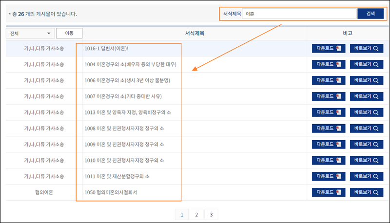 이혼 또는 이혼서류를 검색해 보세요. 그럼 무료다운이 가능한 26개의 양식이 나타나는데요. 이혼을 진행함에 있어서 사용될 수 있는 양식이 대부분 나와요.