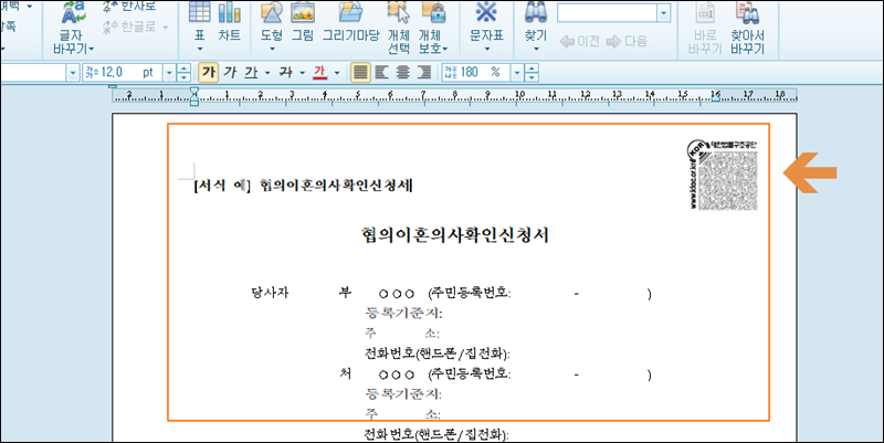 다운 받은 이혼서류 양식을 열어보았어요. 당사자의 이름, 주민등록번호, 등록기준지, 주소, 전화번호와 같은 개인정보를 기재하도록 되어 있어요.